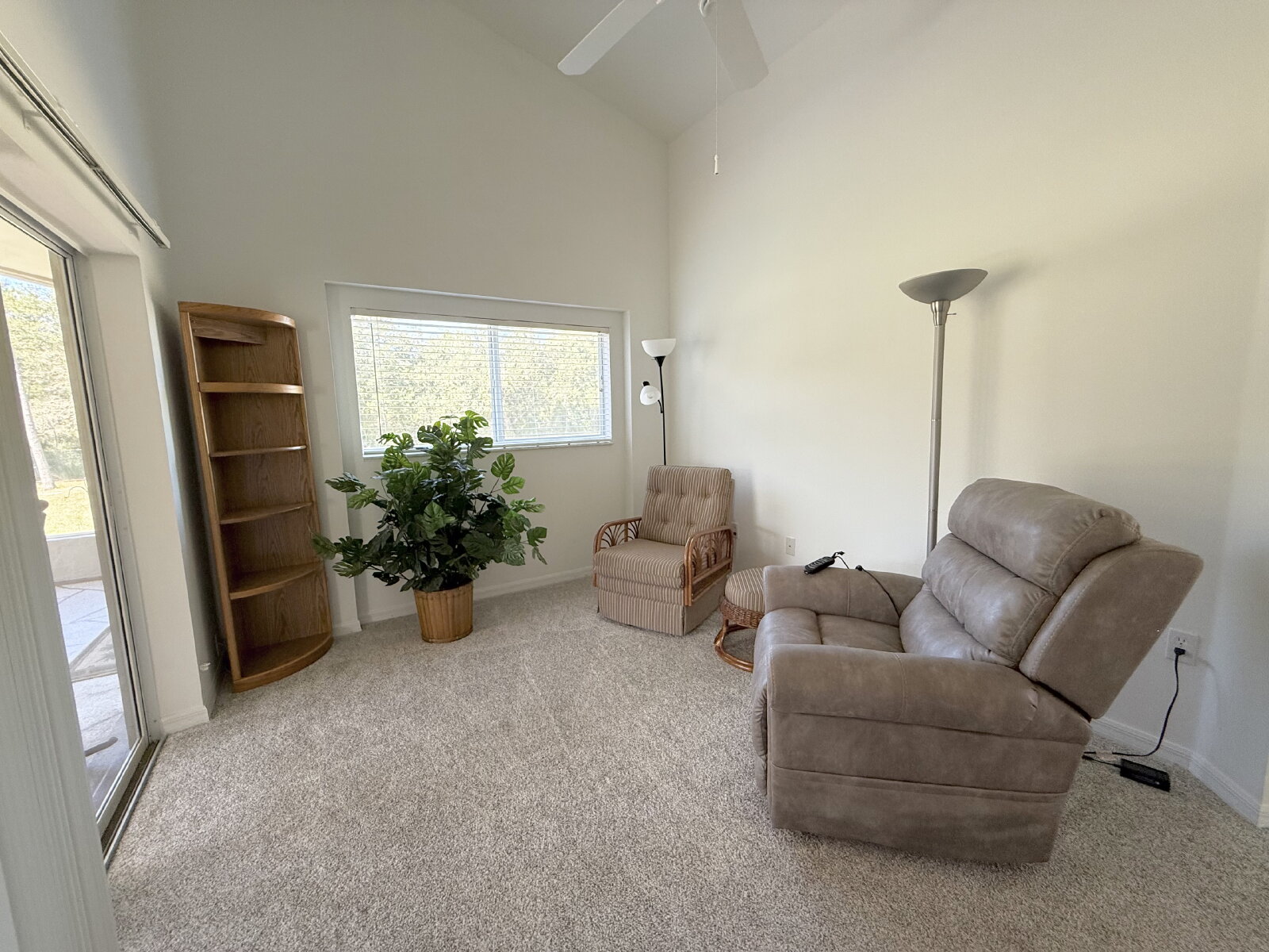 Step inside to find a large formal living and dining area, perfect for hosting or relaxing. The kitchen features an island, dishwasher, and abundant counter space, opening to a secondary dining area and cozy TV room. From here, you can step out onto the large screened lanai—ideal for enjoying Florida’s year-round sunshine.