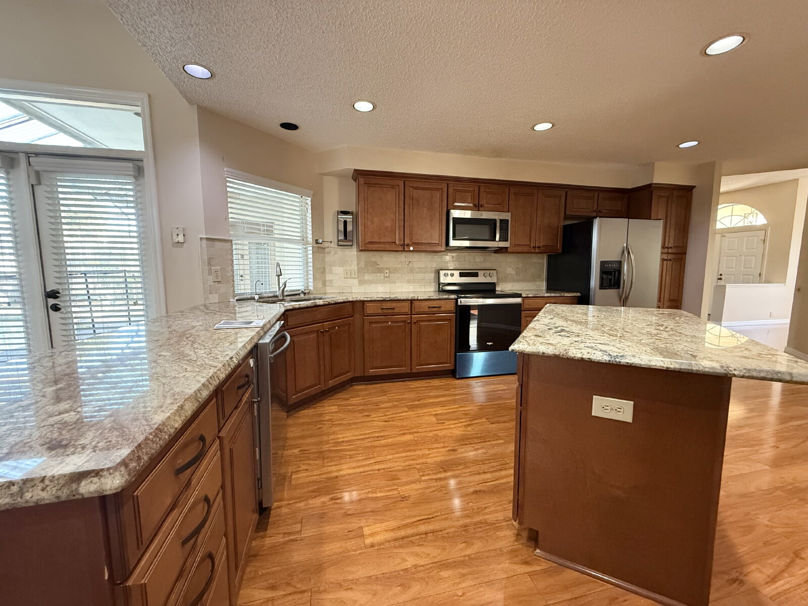 Continue through to the spacious kitchen, which offers a large island, stainless steel appliances, and a pantry for ample storage. The laundry room sits just off the kitchen and includes granite counters, a utility sink, and washer and dryer for tenant convenience.