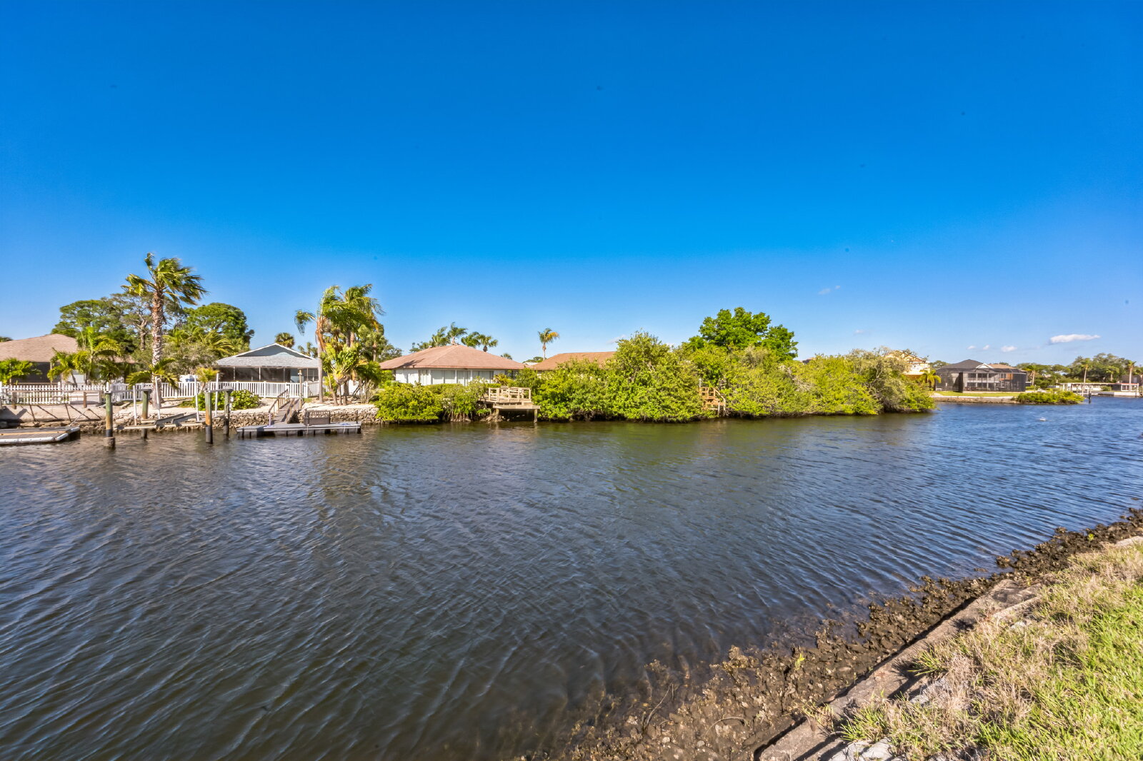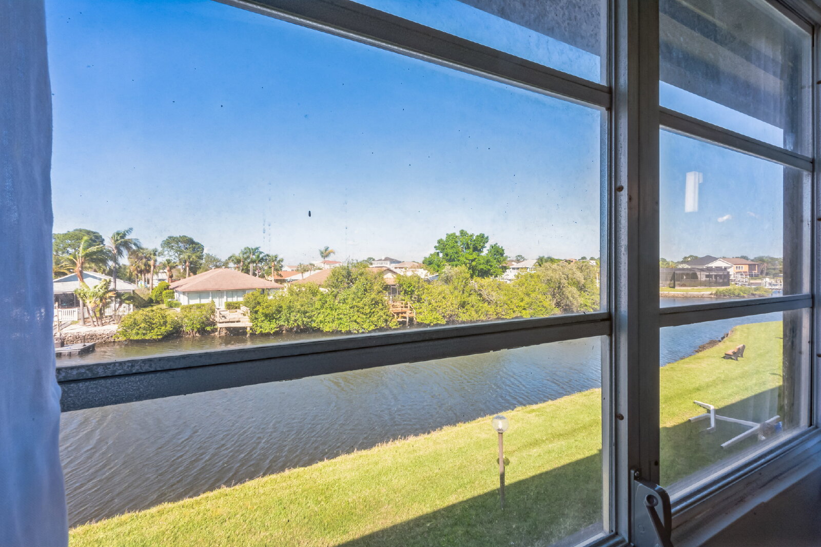 The condo features tile floors throughout and an updated kitchen with stone countertops, a tile backsplash, and stainless appliances. The open floor plan flows from the dining area to the living room, with an additional space at the back that’s perfect for a sitting area or office overlooking the water. The bedroom features a large closet and window for added light. The bathroom has been tastefully updated with a granite-topped vanity and tile backsplash.