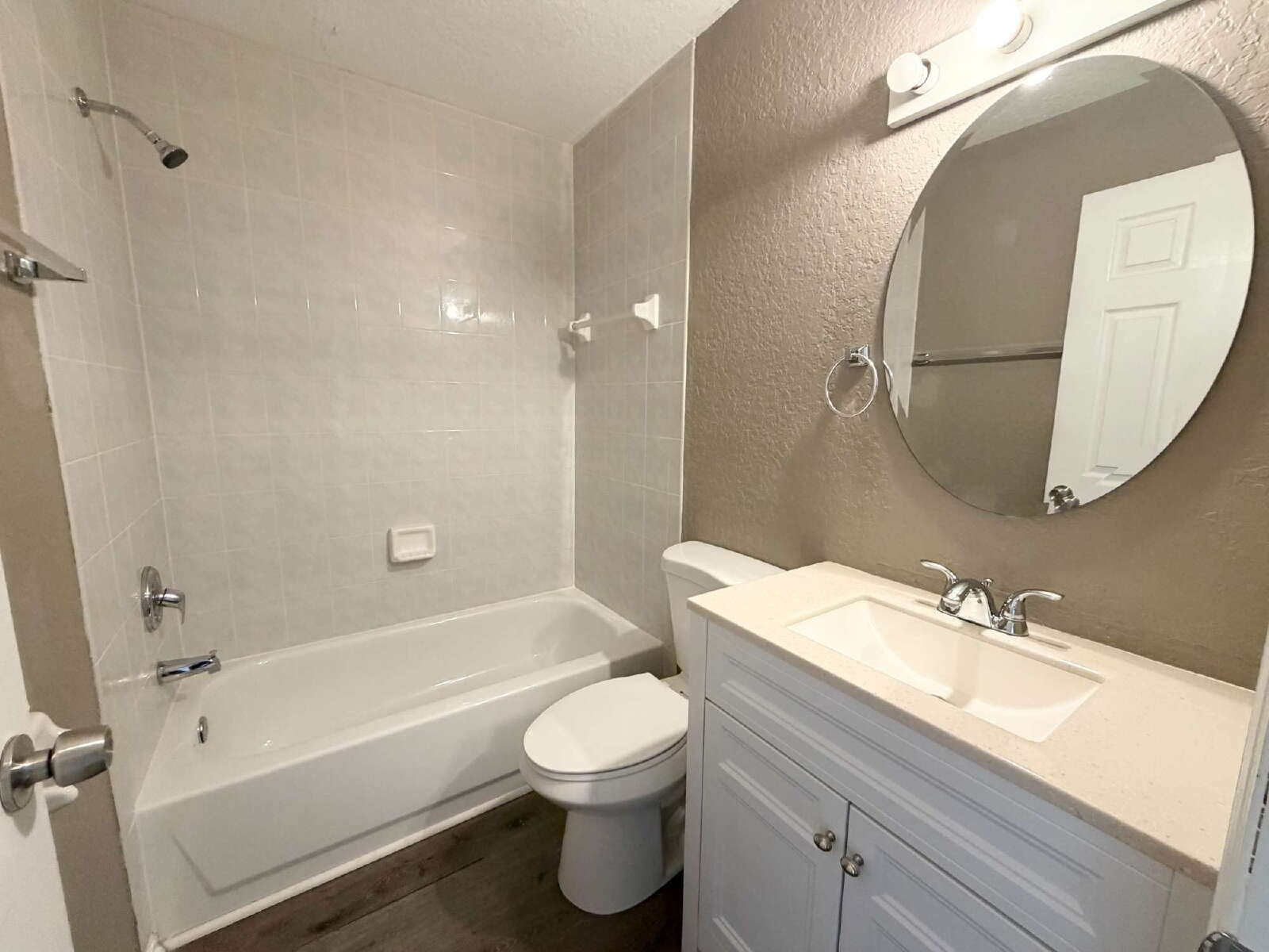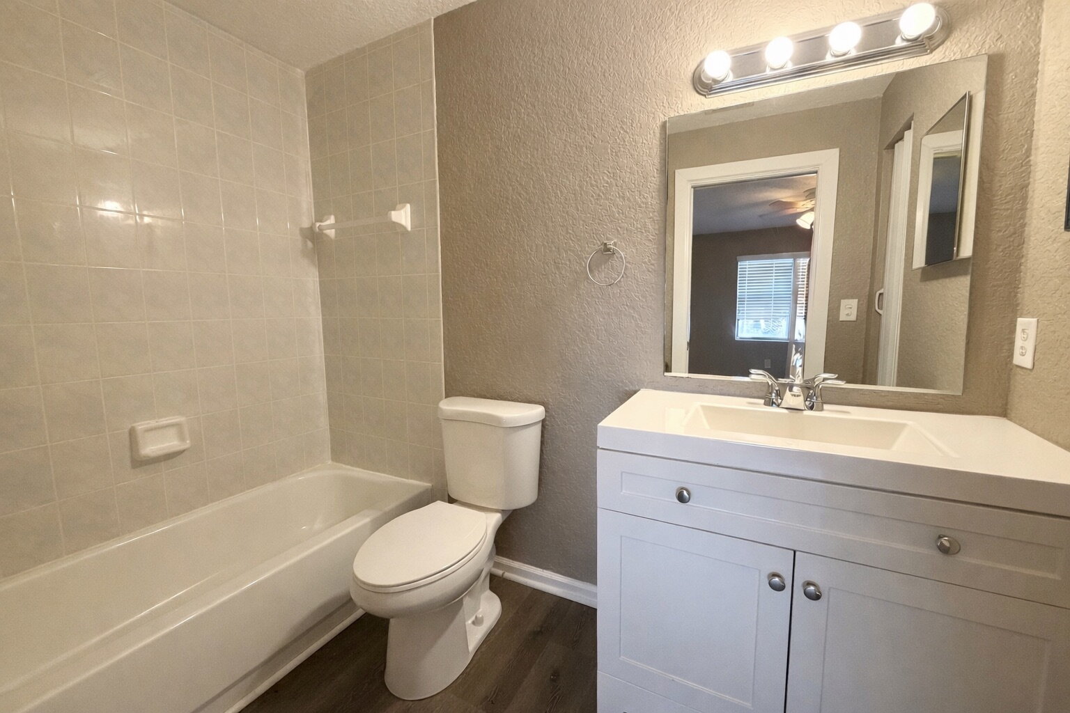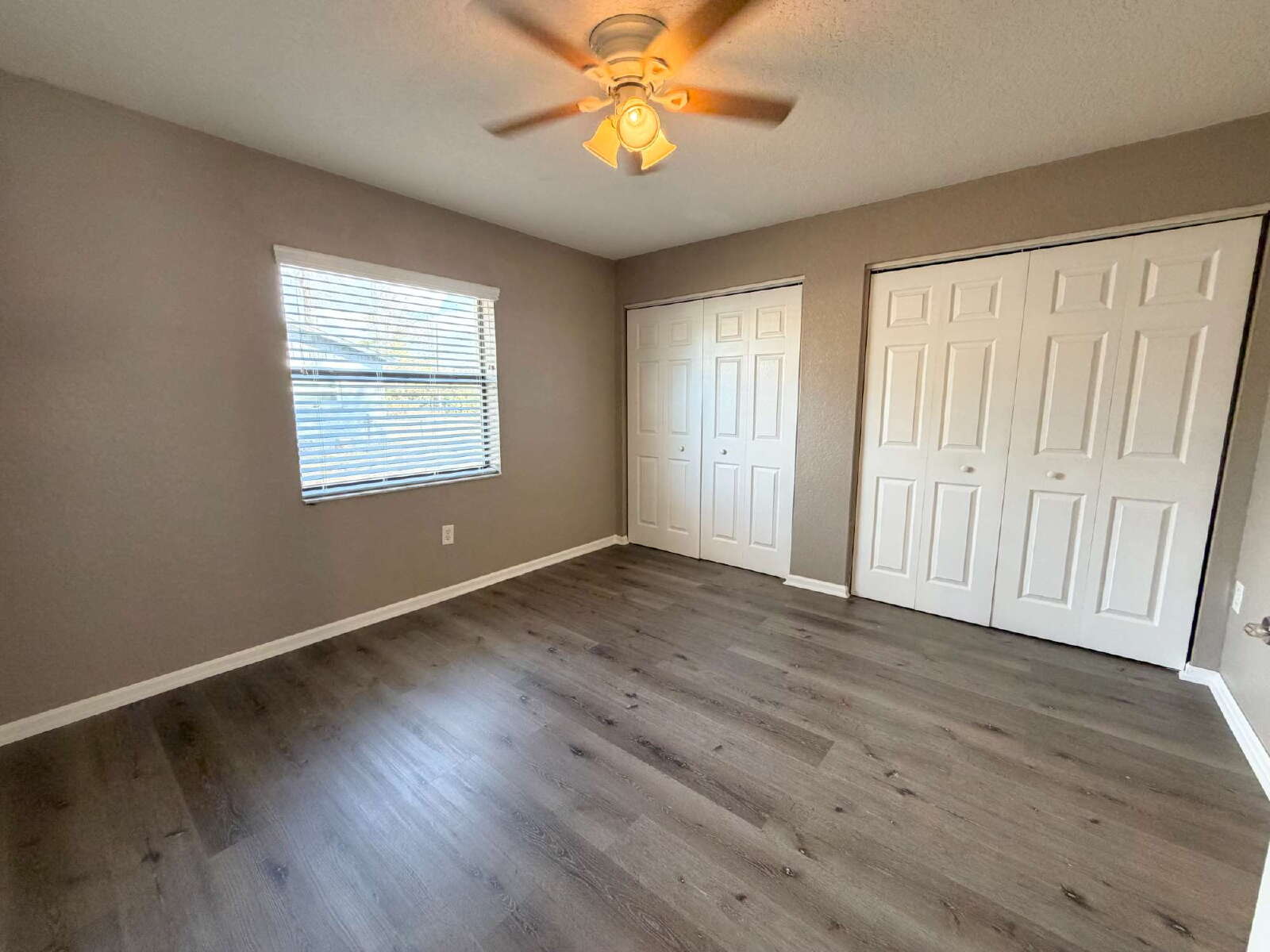 Welcome to this beautifully maintained 2-bedroom, 2-bathroom duplex with a 1-car garage that includes lawn service! The home features luxury vinyl plank flooring and soft neutral paint throughout for a clean, modern feel. Upon entry, you’ll find a guest bedroom and full bathroom to the left, while the garage with washer and dryer hookups is conveniently located to the right.
