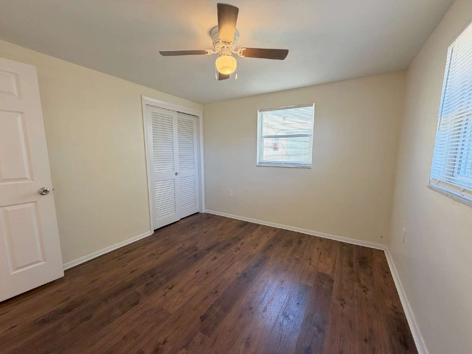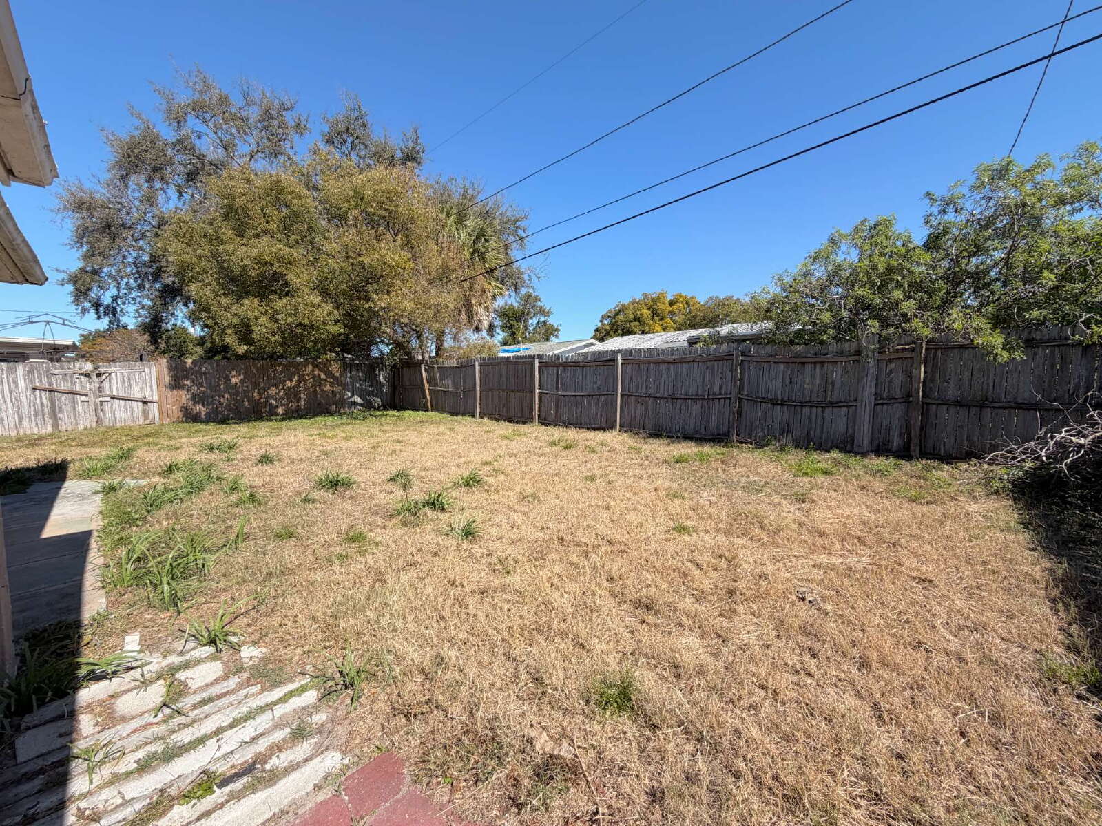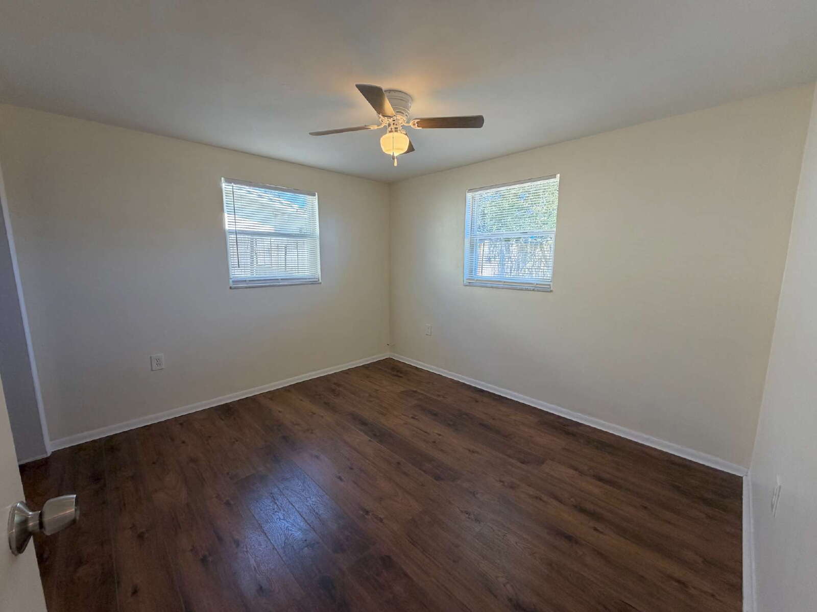 Off the kitchen is a hallway leading to two bedrooms and a full bathroom. Toward the rear of the home, the third bedroom offers windows on three sides, providing abundant natural light, and direct access to the covered porch and fully fenced backyard—perfect for enjoying outdoor space.