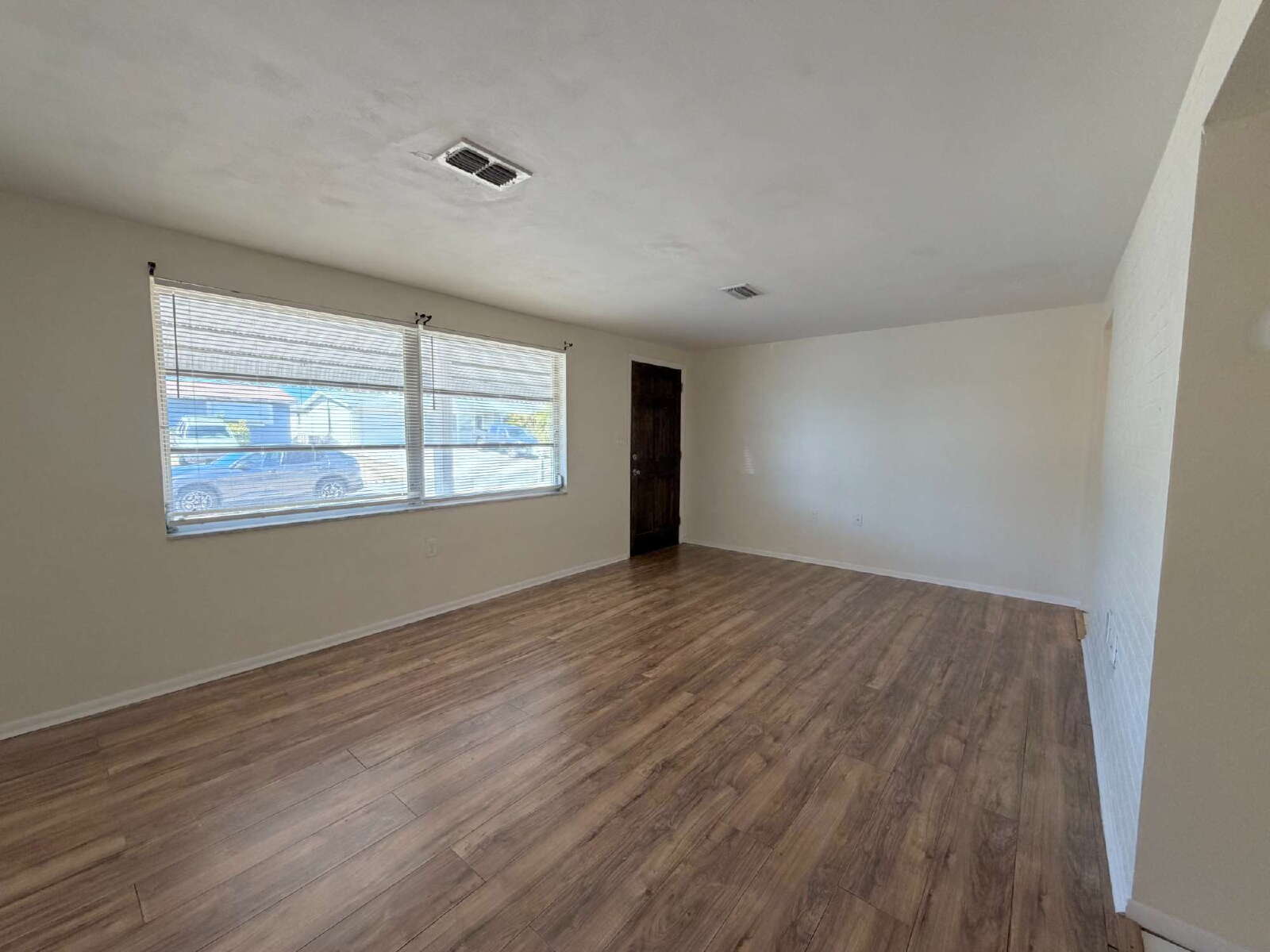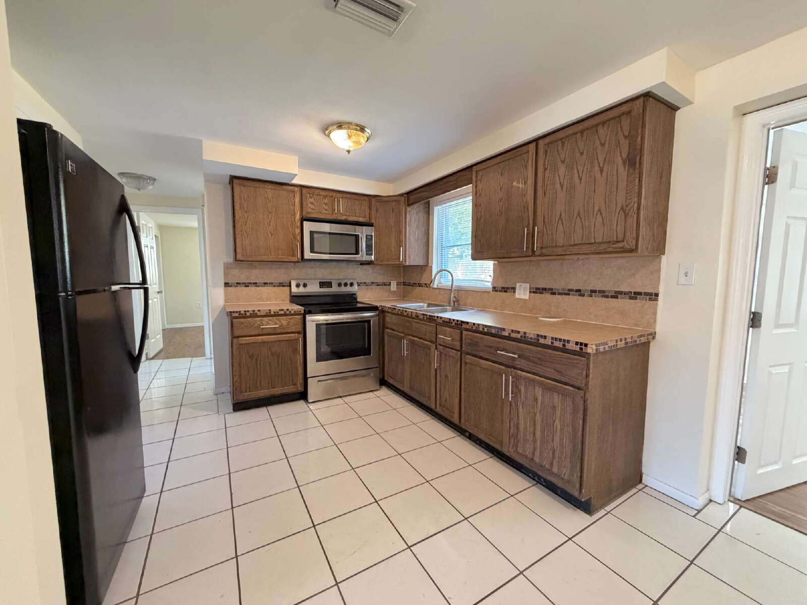 Welcome to this 3-bedroom, 2-bathroom home featuring light paint tones, vinyl plank flooring, and plenty of natural light throughout. Upon entry, you are welcomed into the living room, which flows seamlessly into the eat-in kitchen with space for a dining table. The kitchen is equipped with a stainless steel stove and microwave, and a window over the sink overlooking the backyard.