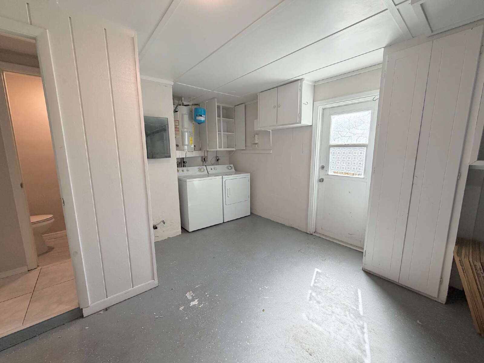 Welcome to this 2-bedroom, 2-bathroom home featuring a fully fenced yard and functional layout. Enter into the main living area with tile flooring throughout, offering a clean and low-maintenance space. To the right, the kitchen features bright white cabinetry, granite countertops, and stainless steel appliances. Just off the kitchen is a full bathroom with a stand-up shower.