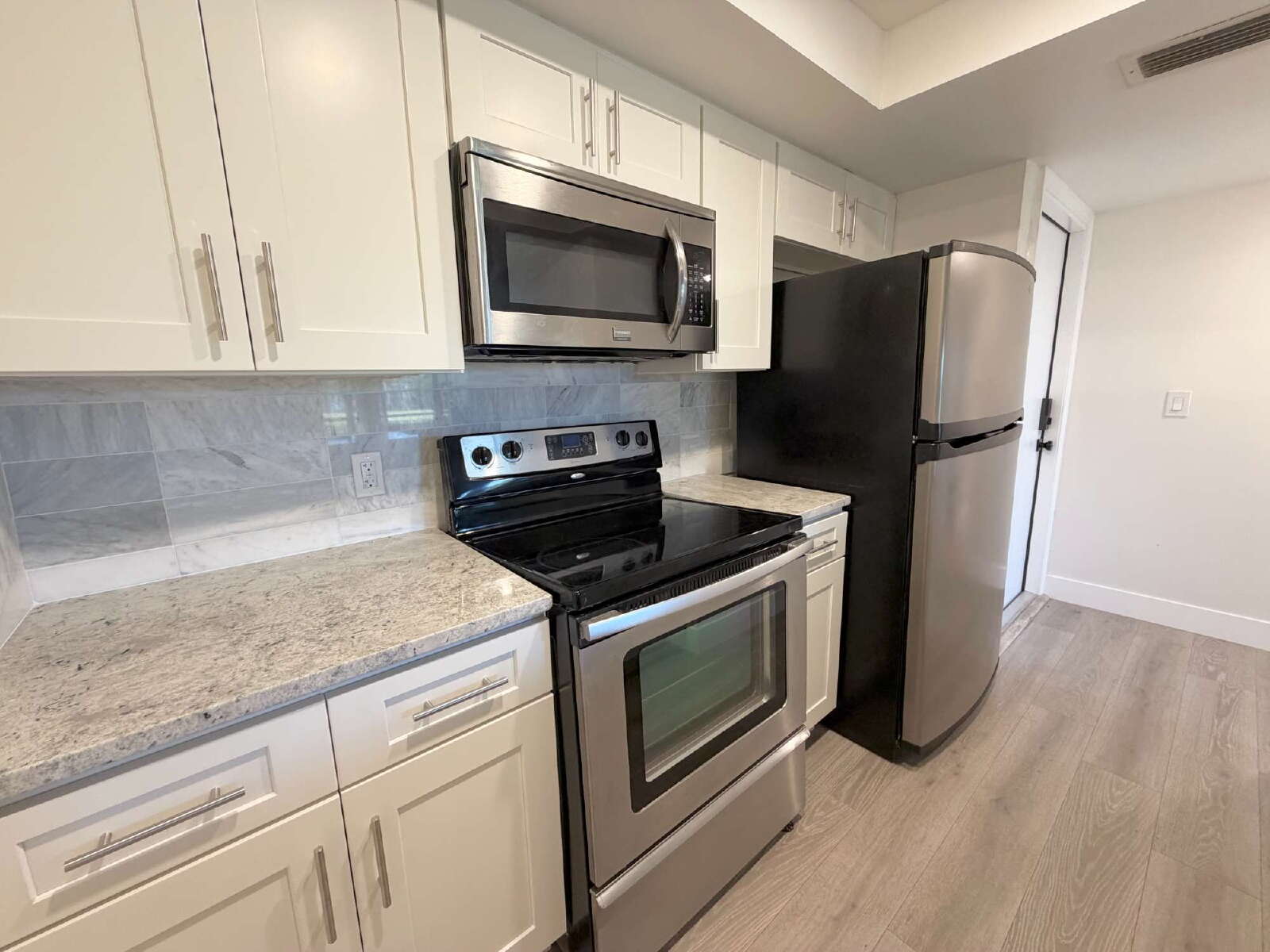 Welcome to this newly remodeled studio, 1-bathroom unit offering a clean, modern feel with thoughtful upgrades throughout. Upon entry, you’re greeted by a beautifully updated kitchen featuring upgraded stone countertops, stainless steel appliances, a tasteful backsplash, and a breakfast bar with space for barstools.