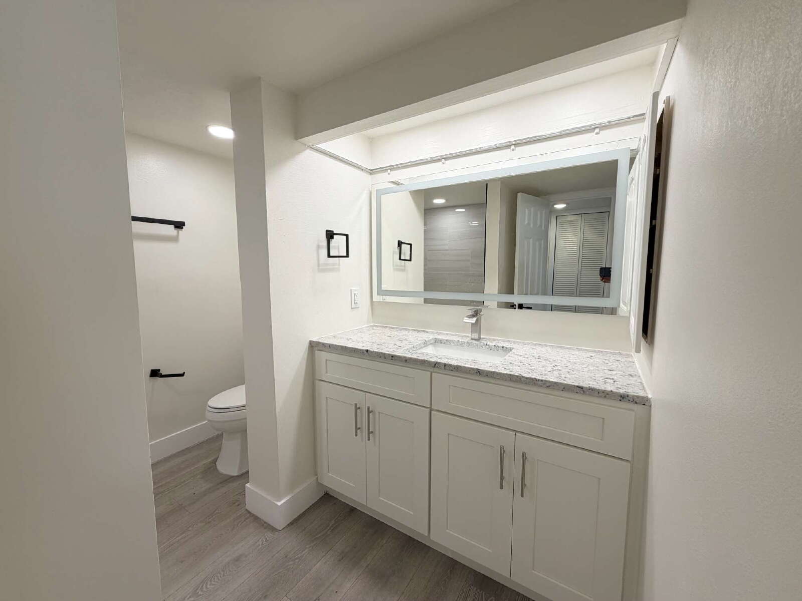 To the left is the fully renovated bathroom, designed with matching finishes and a spacious tub/shower combo with a large soaking tub. Just off the bathroom is a generous walk-in closet, conveniently accessible from both the bathroom and the main living space.