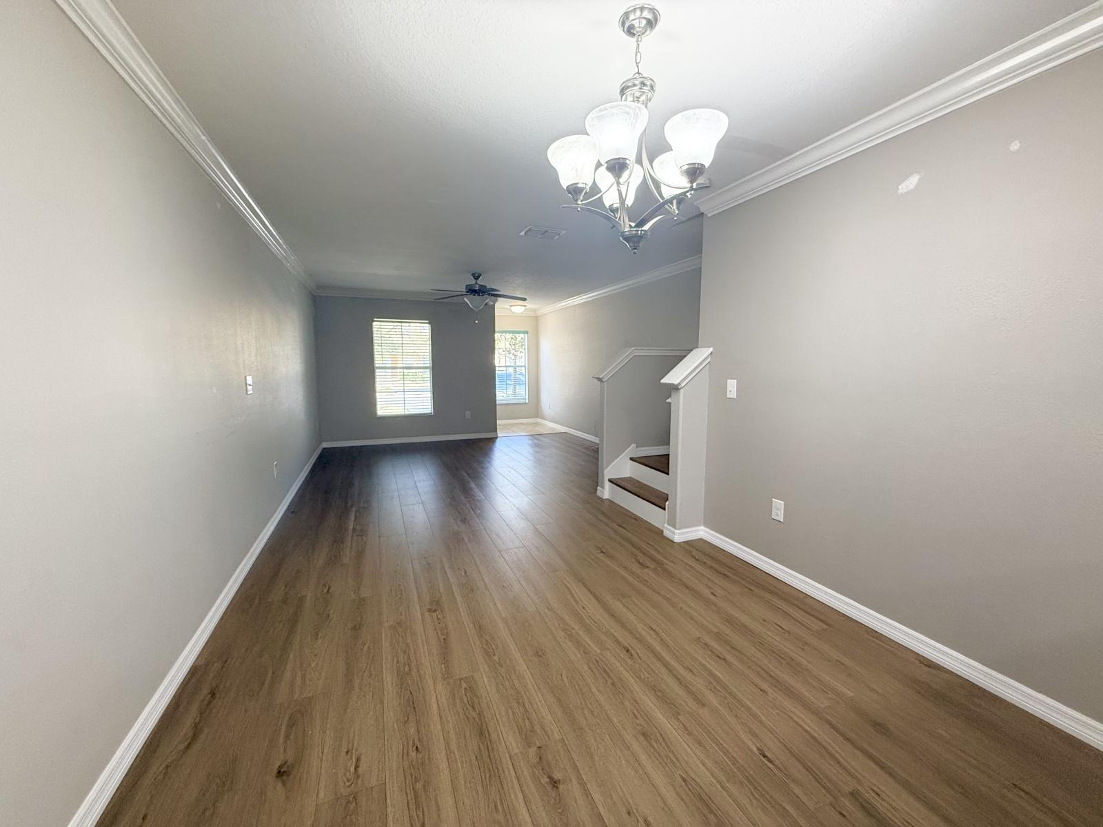 Welcome to this 3-bedroom, 3-bath townhome, updated with new vinyl plank flooring and neutral paint throughout. The modern kitchen offers granite countertops, stainless steel appliances, and ample cabinetry, all flowing seamlessly into the open dining and living area. The bottom floor also includes a downstairs bathroom and bedroom with direct access to a private, fenced paver patio. Upstairs, the two primary suites each feature en suite bathrooms and spacious walk-in closets, with a conveniently located laundry room between them.